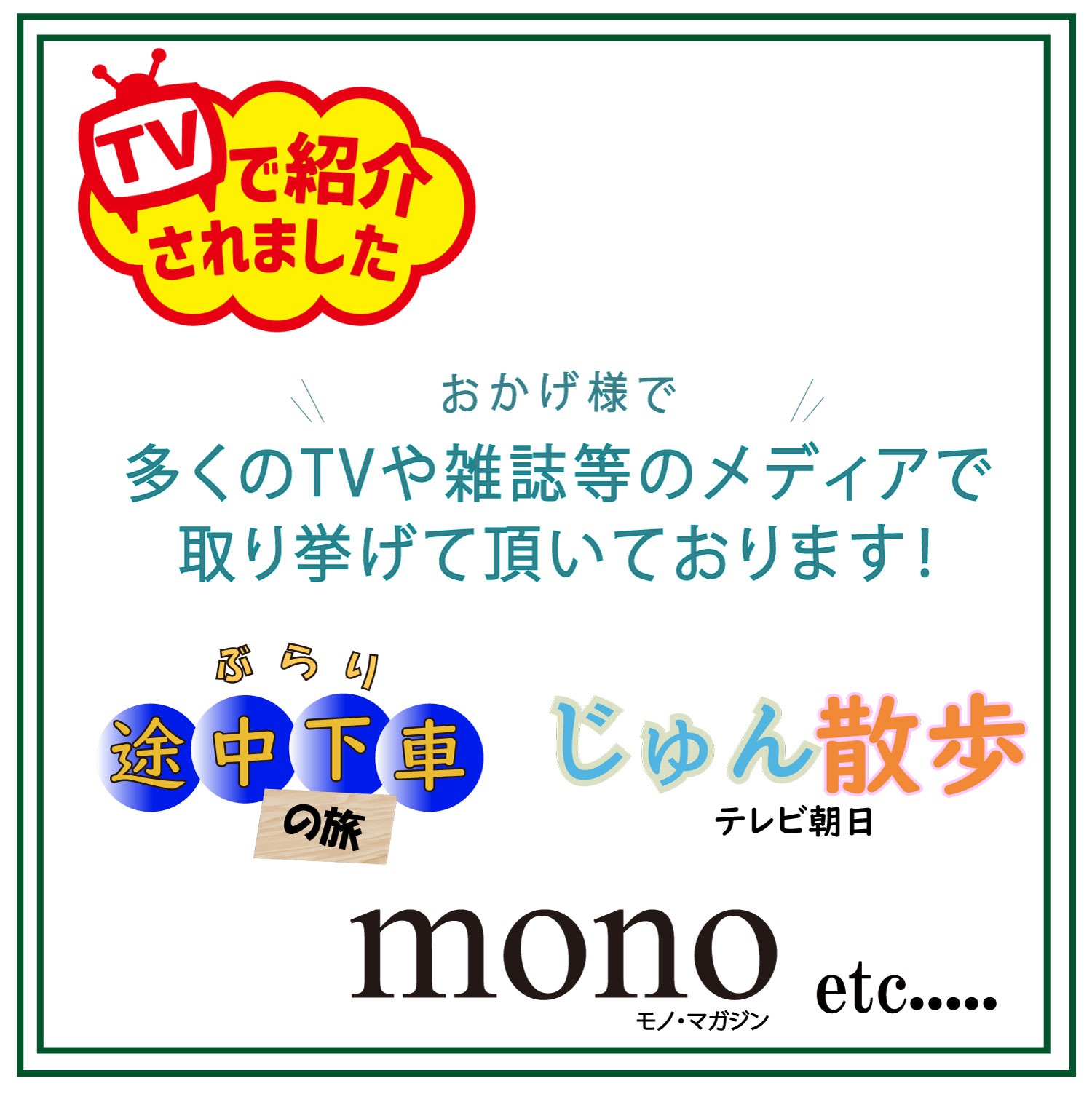 人気旅番組『ぶらり途中下車の旅』『じゅん散歩』や『モノマガジン』など、多数メディアで取り上げて頂いた商品です。