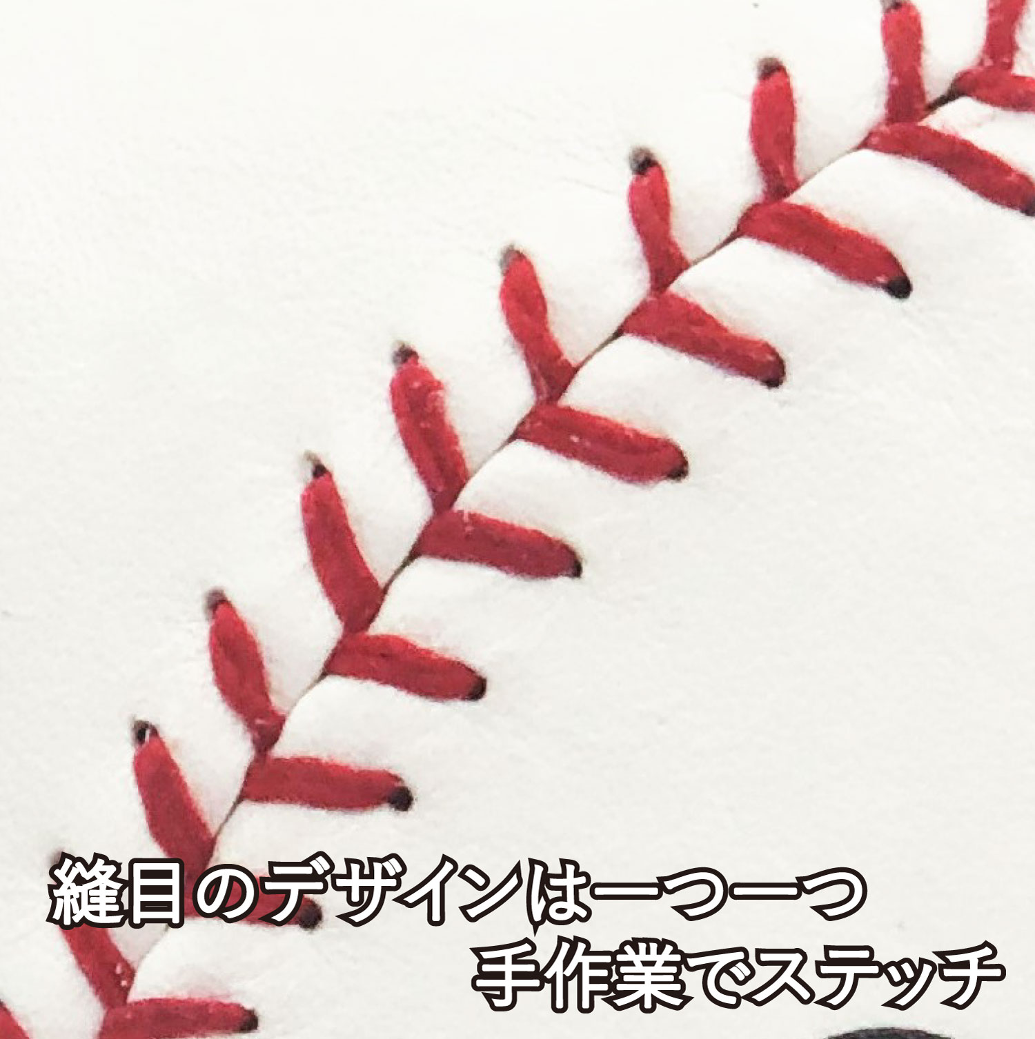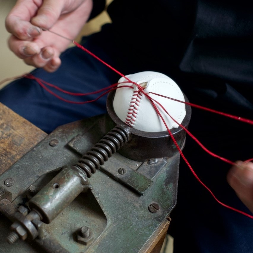 硬式野球ボールの製造で重要な工程である縫い合わせ作業は、機械ではなく全て手作業で行っています。野球ボール型ミニポーチは硬式野球ボールと同じ工程で手縫いでの縫い合わせを行っています。