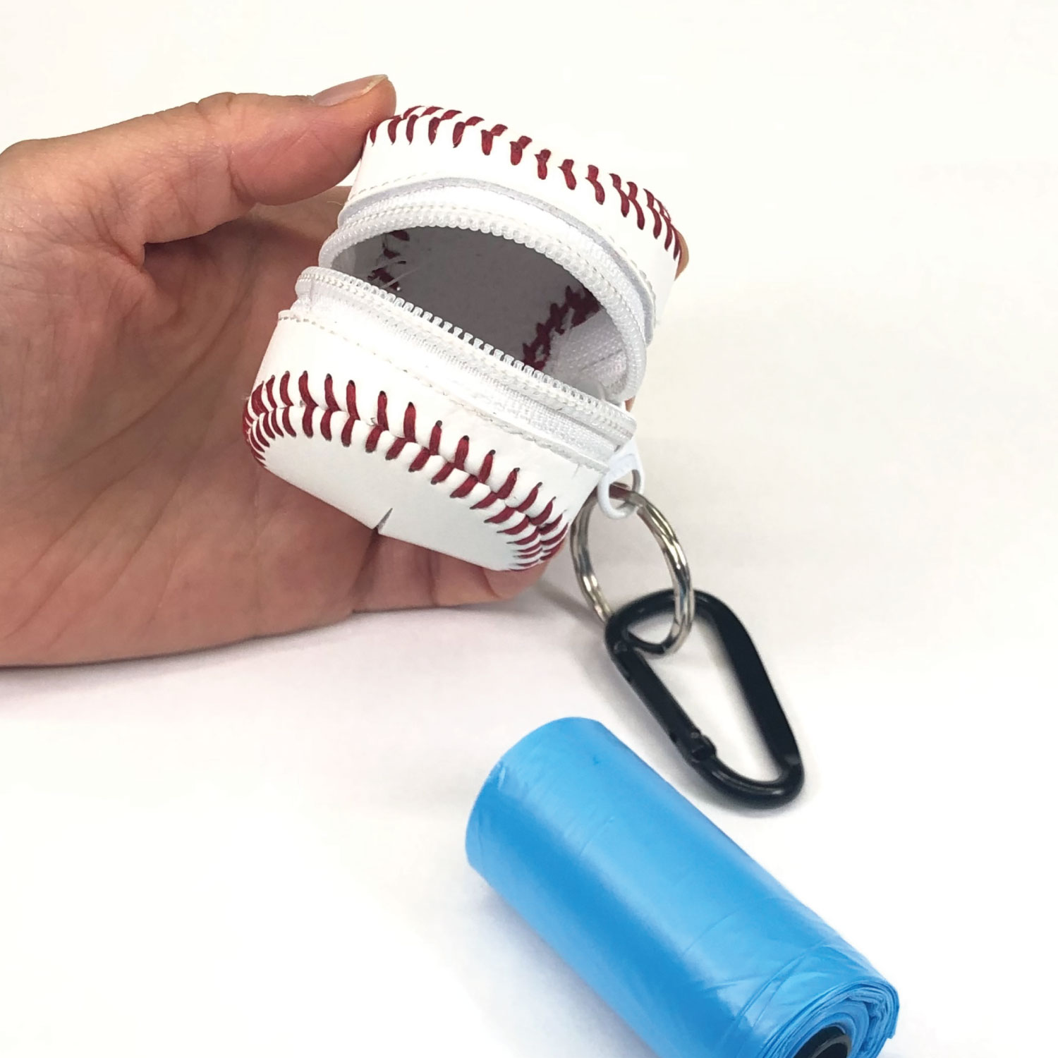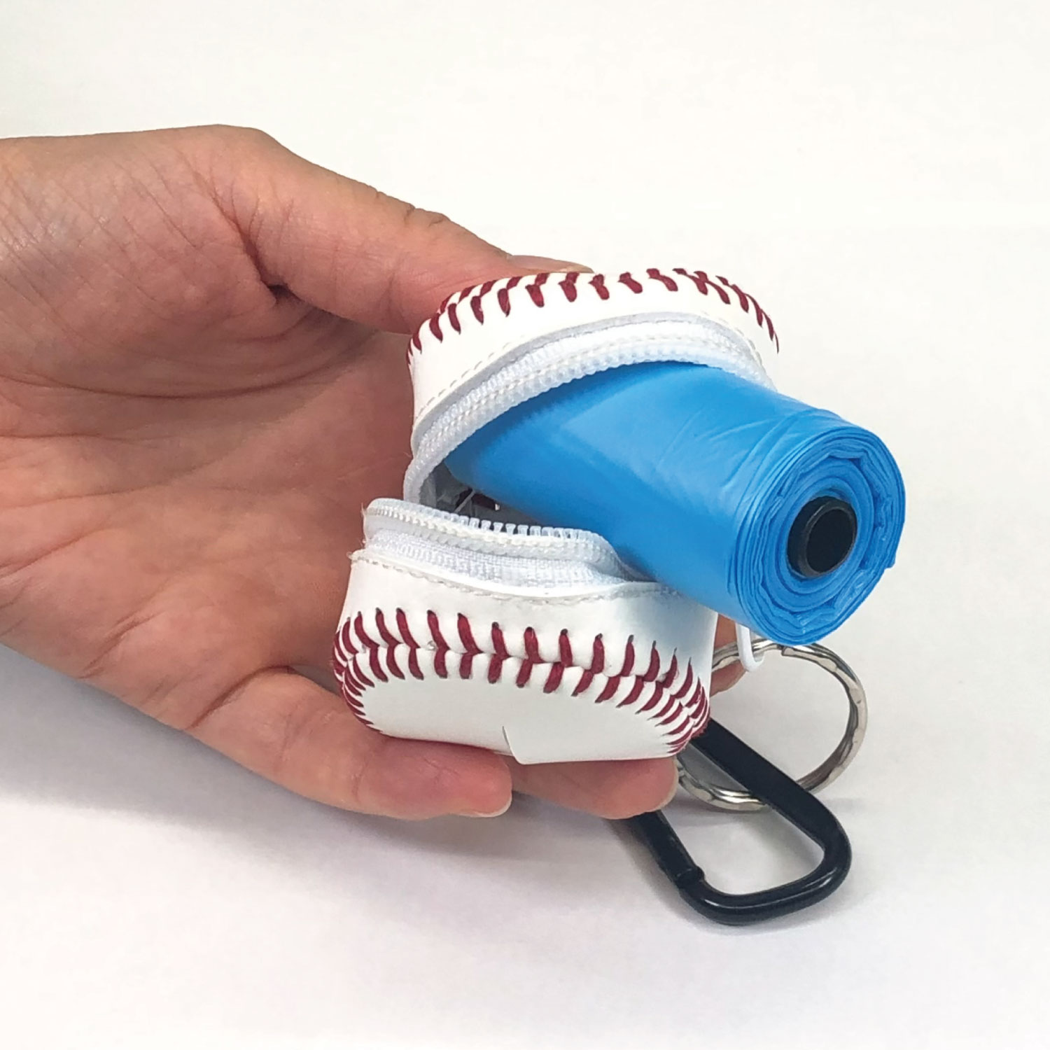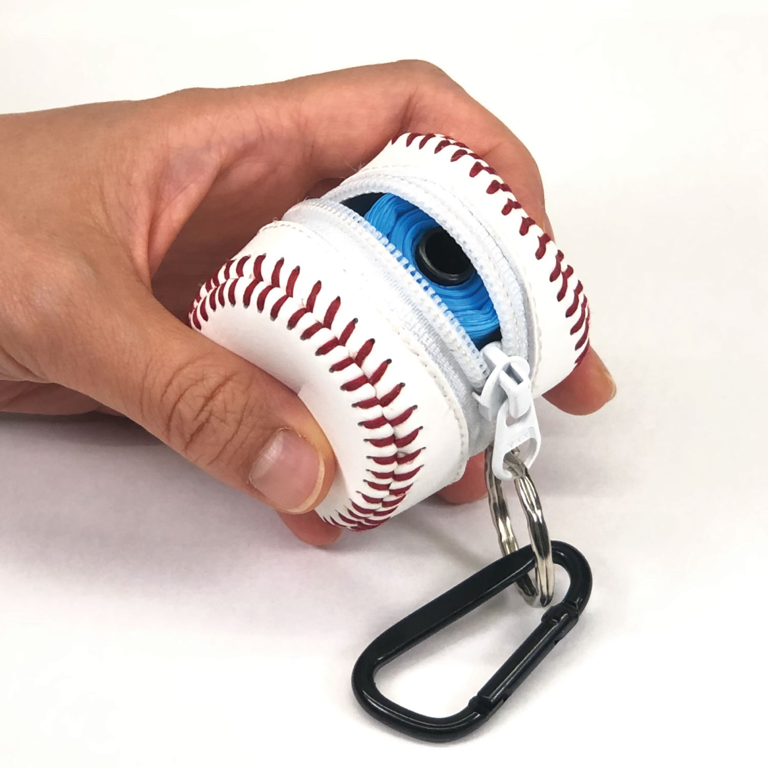 野球ボール型ミニポーチにはカラビナがついていますので、携帯時には鞄などに取り付けることも出来ます。