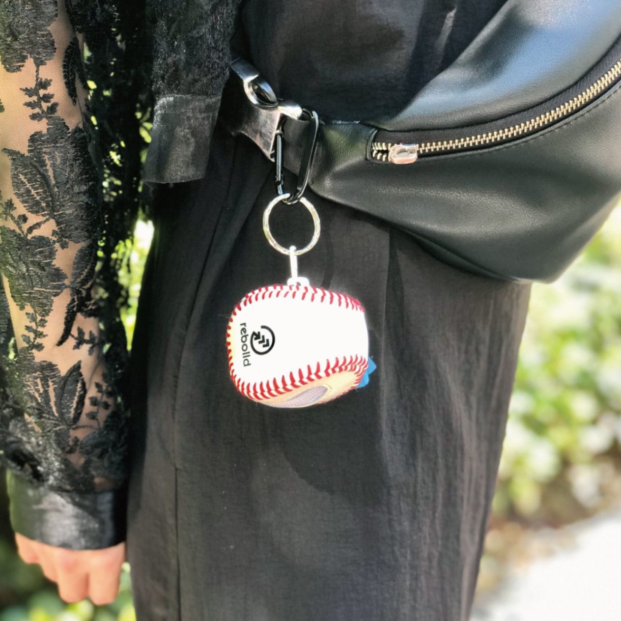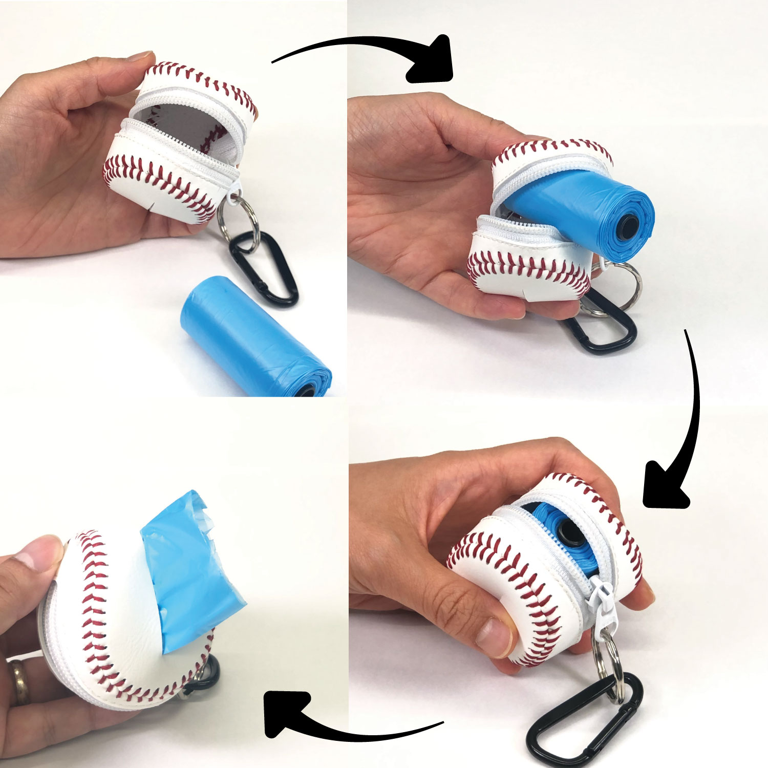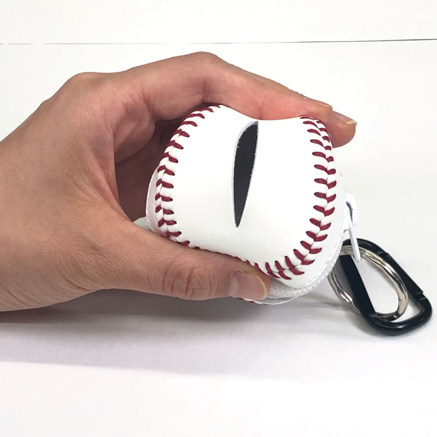 野球ボール型ミニポーチにはカラビナがついていますので、携帯時には鞄などに取り付けることも出来ます。